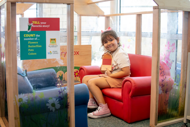 Part of the Playful Learning Initiative in San Diego, the City Heights Library features bilingual signage that encourages families to explore math, literacy, storytelling, nature, and culture through play and conversation.