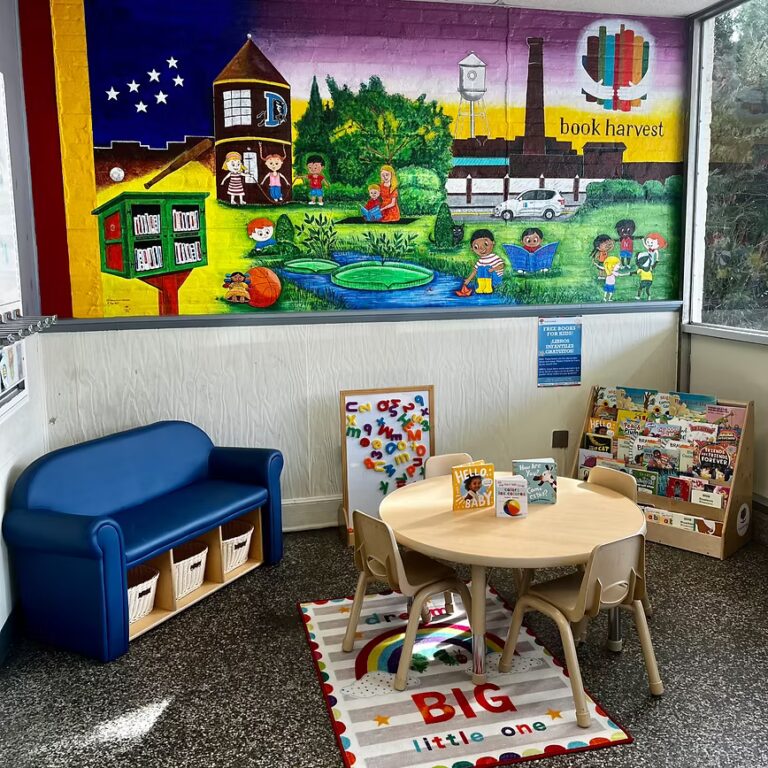 The Playful Learning Laundromat in Durham, NC, features a mural, letter wall, and reading nook that transform wait time into joyful opportunities for literacy and family connection.