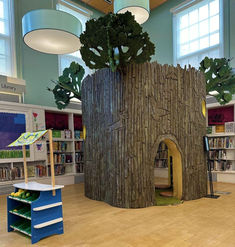 The Logan Library Tree brings imagination and play to the children’s section with a life-sized tree, hidden animal designs, and a cozy reading nook.