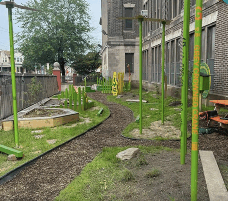This project transformed a vacant lot beside Jay Cooke Elementary into a Serengeti-themed outdoor space with active play, reading areas, and a Little Free Library for students and the community.
