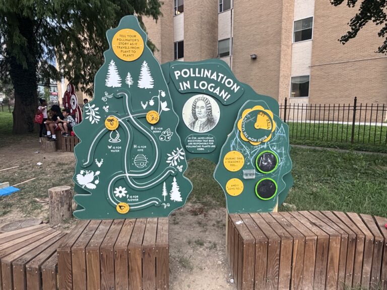 Part of the Play Everywhere Philadelphia initiative, Logan Nook of Discovery is an outdoor gathering space outside the Logan Library where children and families can play and interact around installations that celebrate the history and culture of the surrounding neighborhood.