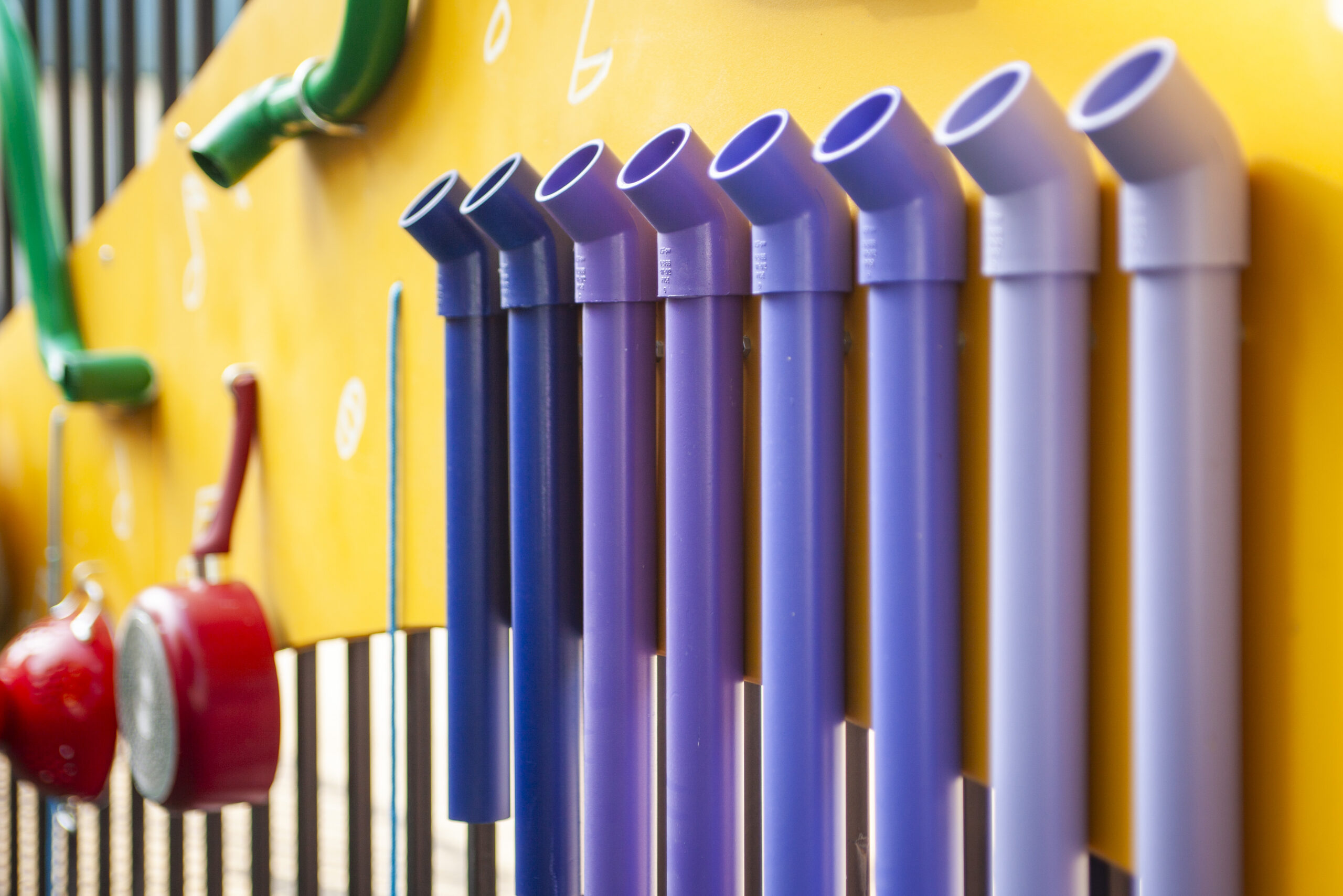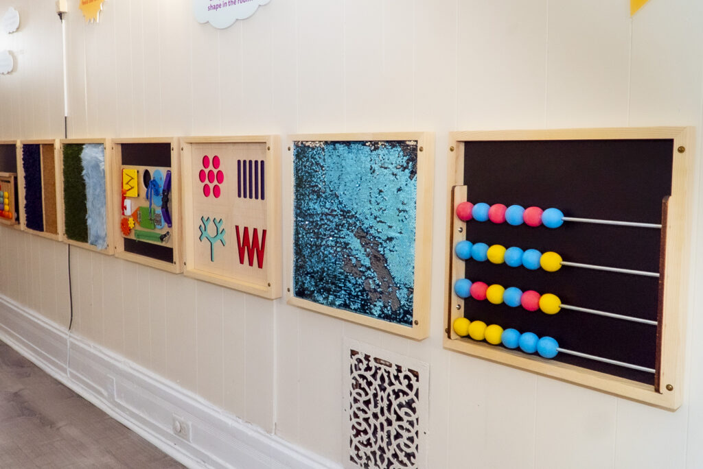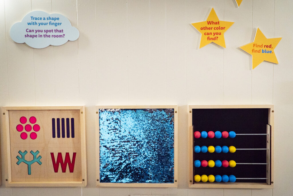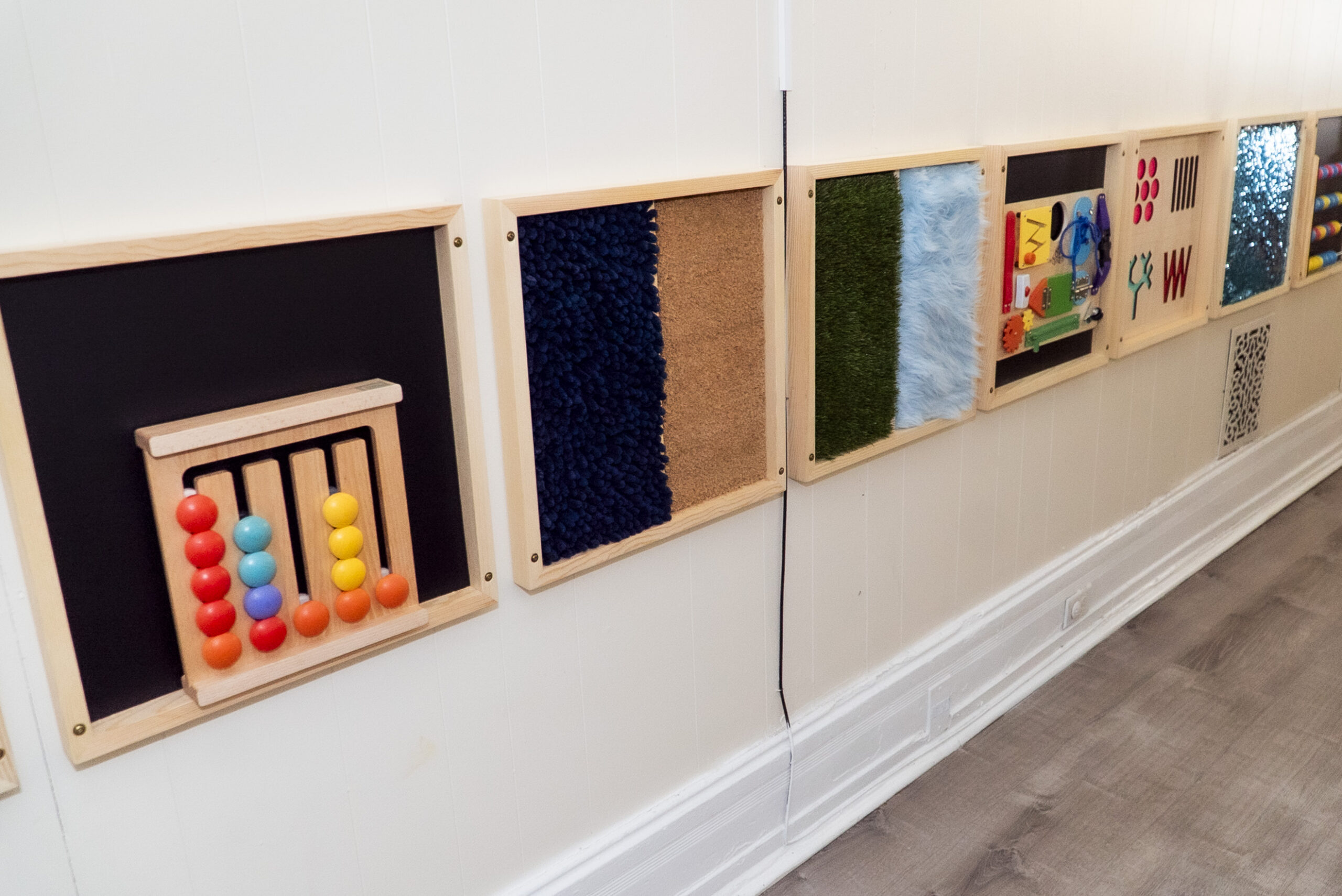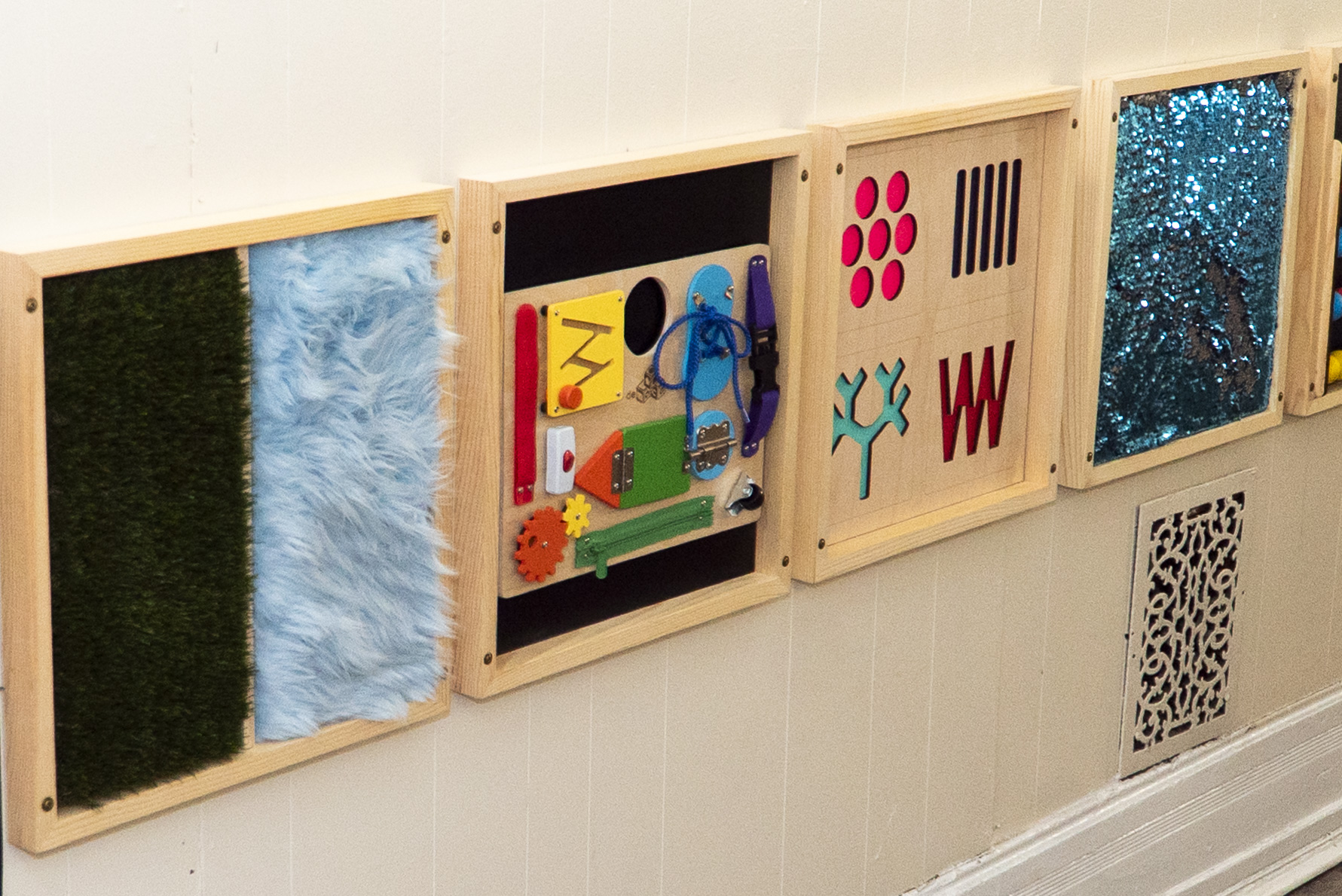 The Baring House Playful Learning installation strengthens communication as children and caregivers explore the sensory wall and musical elements together, describing textures, sounds, and patterns while engaging in shared conversation.