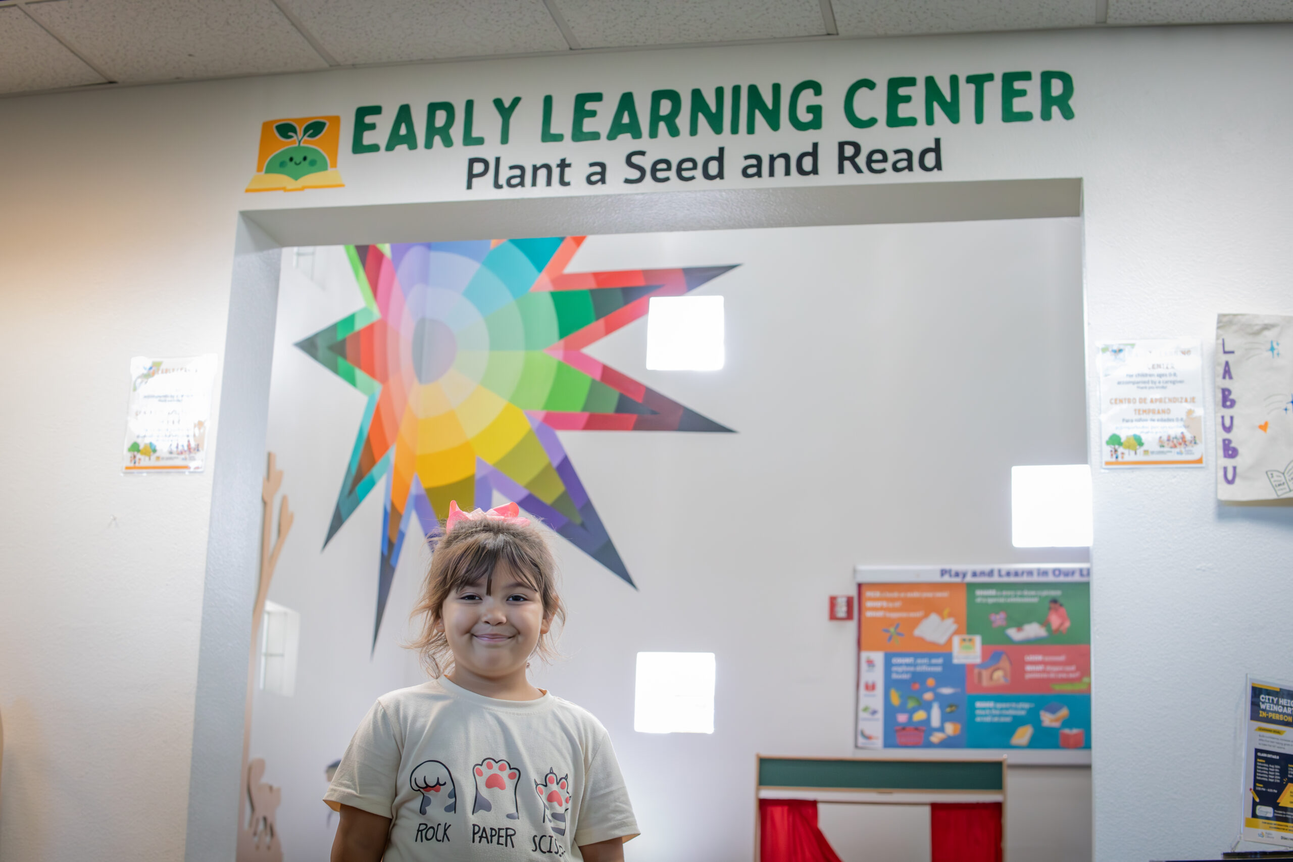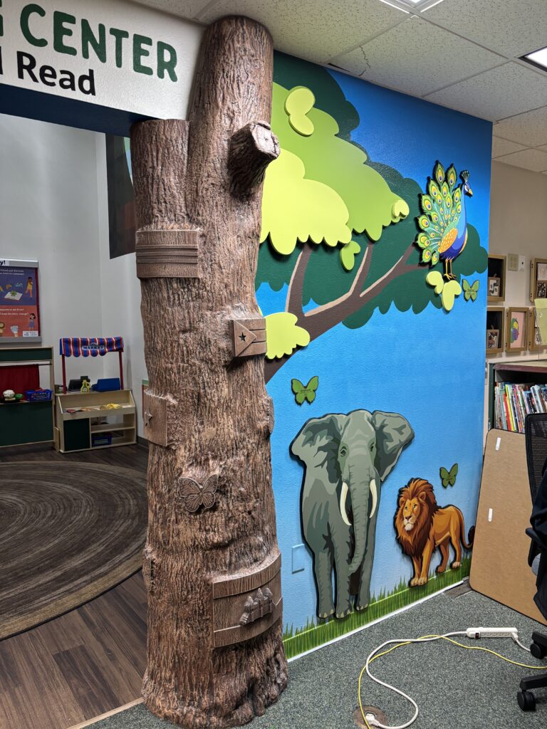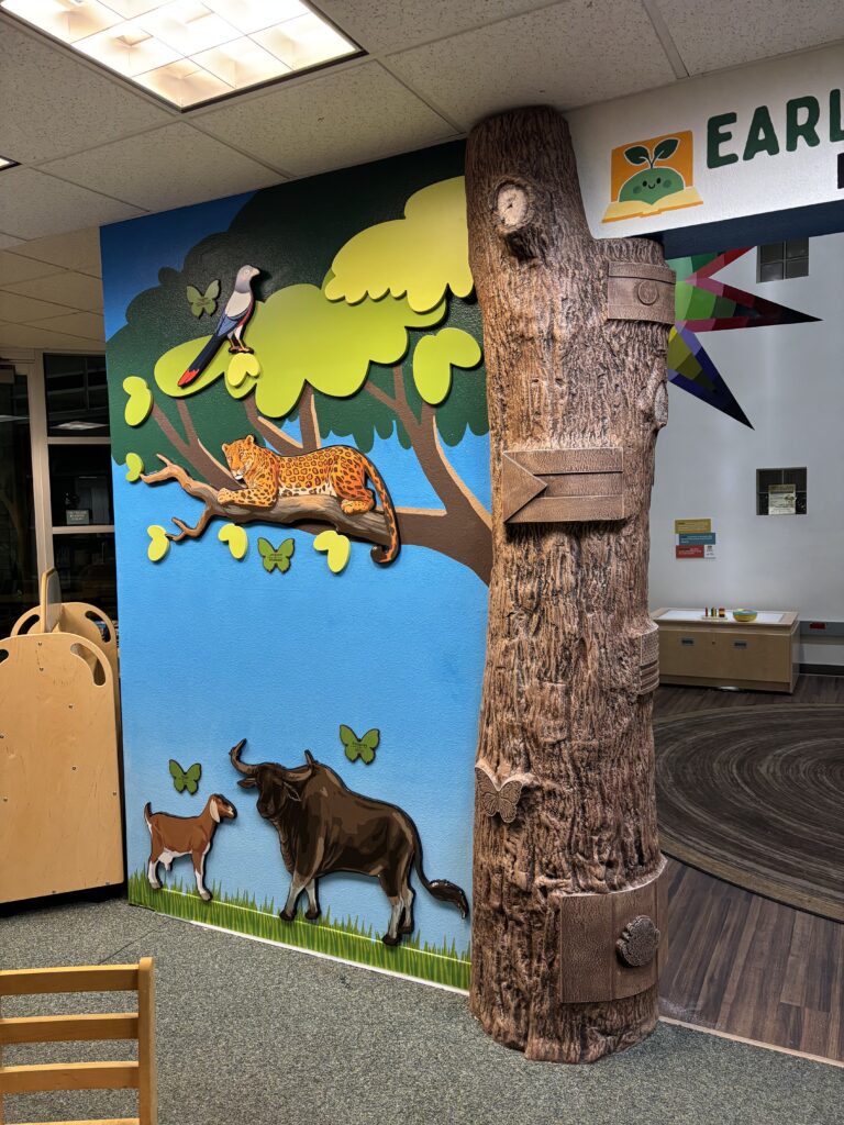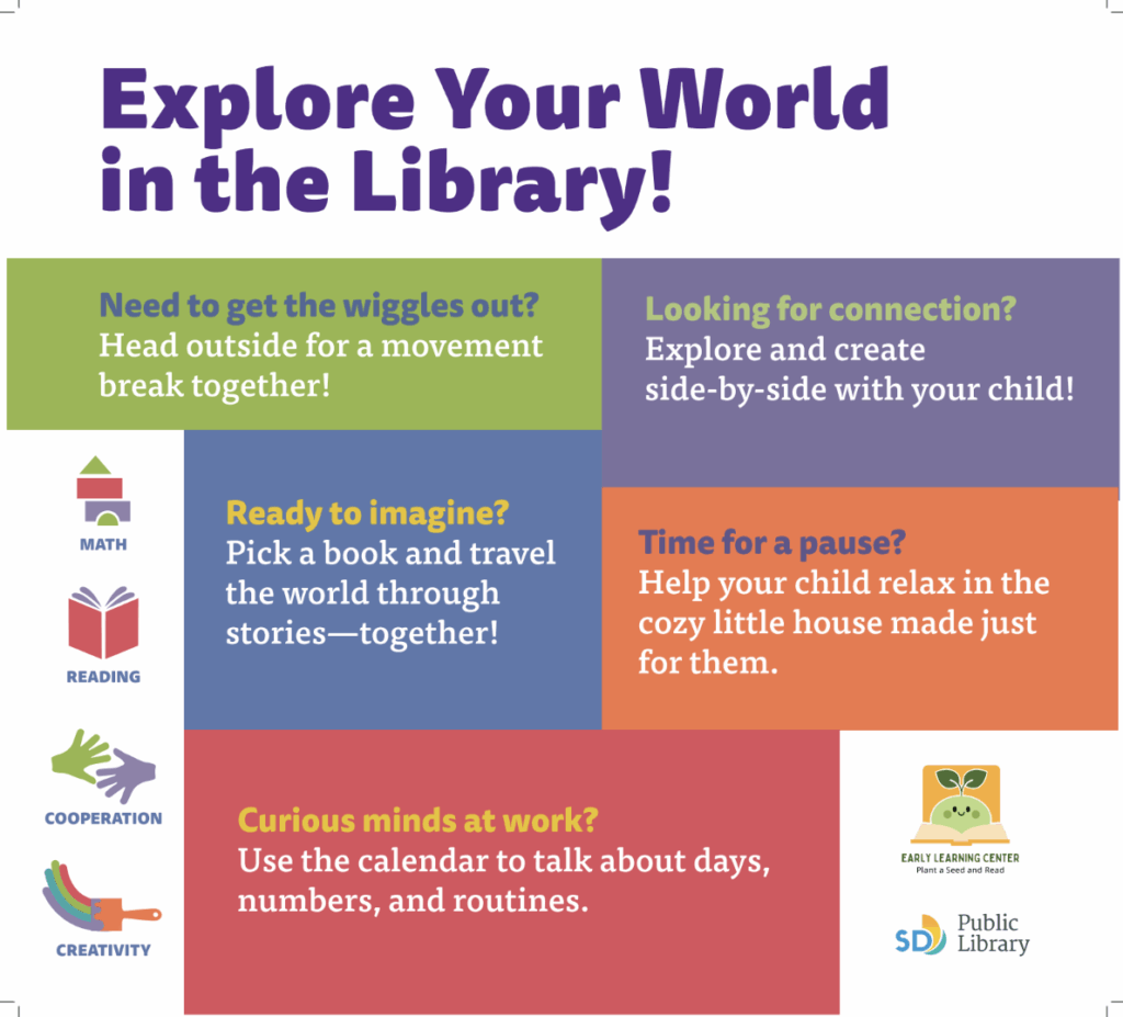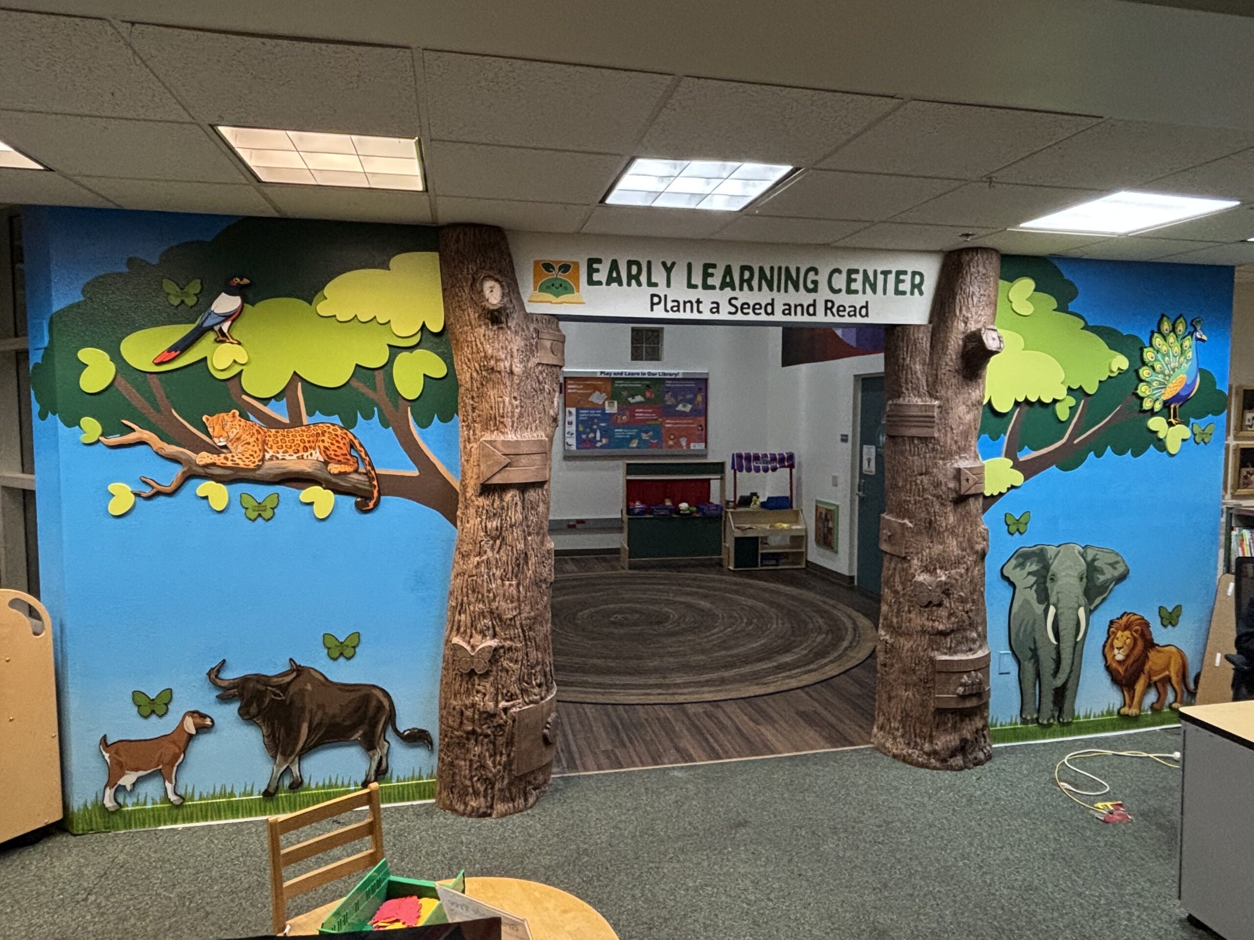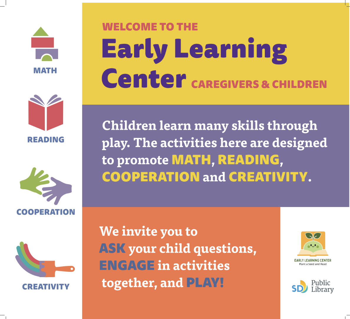 The City Heights Library supports family learning through playful experiences that strengthen early development across the 6Cs framework. Interactive signage builds content knowledge by turning everyday interactions into opportunities to practice math, literacy, storytelling, and nature-based observation. Caregiver prompts encourage communication, helping adults model conversation, ask open-ended questions, and expand children’s vocabulary. The upcoming I-Spy element at the Early Learning Center entrance, currently being fabricated, will promote cultural connection by featuring flags and animals that represent the diverse backgrounds of City Heights residents and inspiring families to share stories about their own heritage. Together, these experiences encourage curiosity, creativity, and shared discovery between children and caregivers.