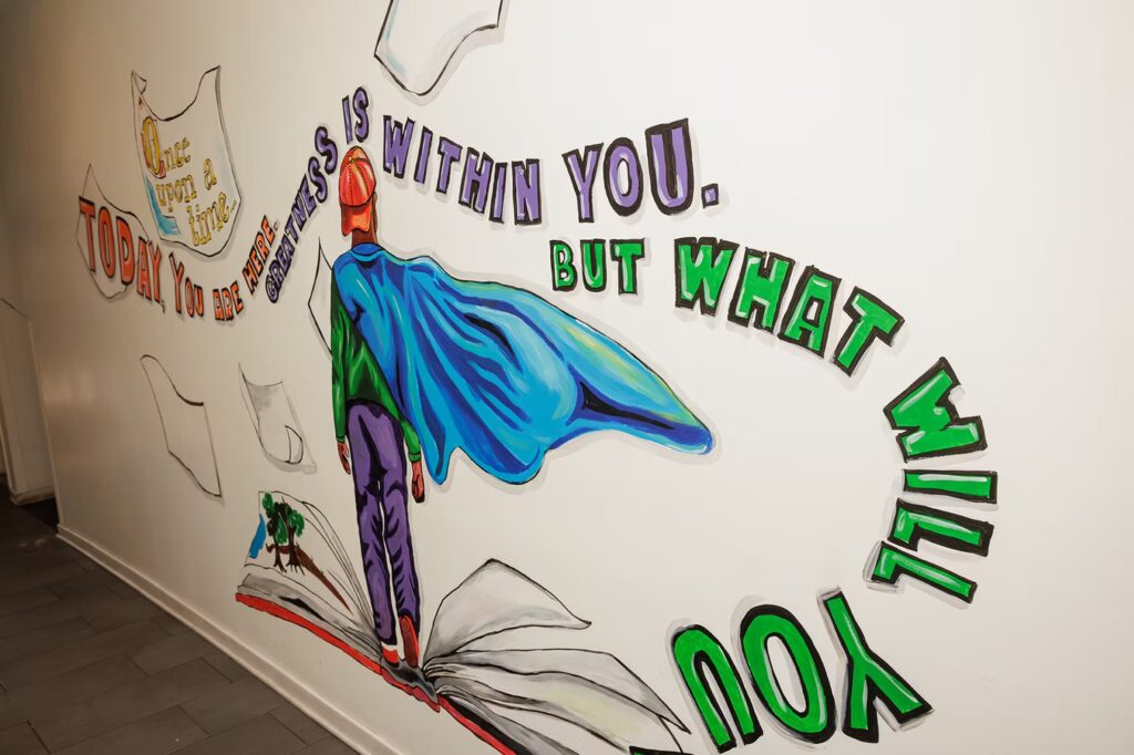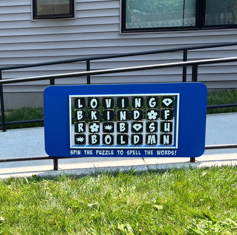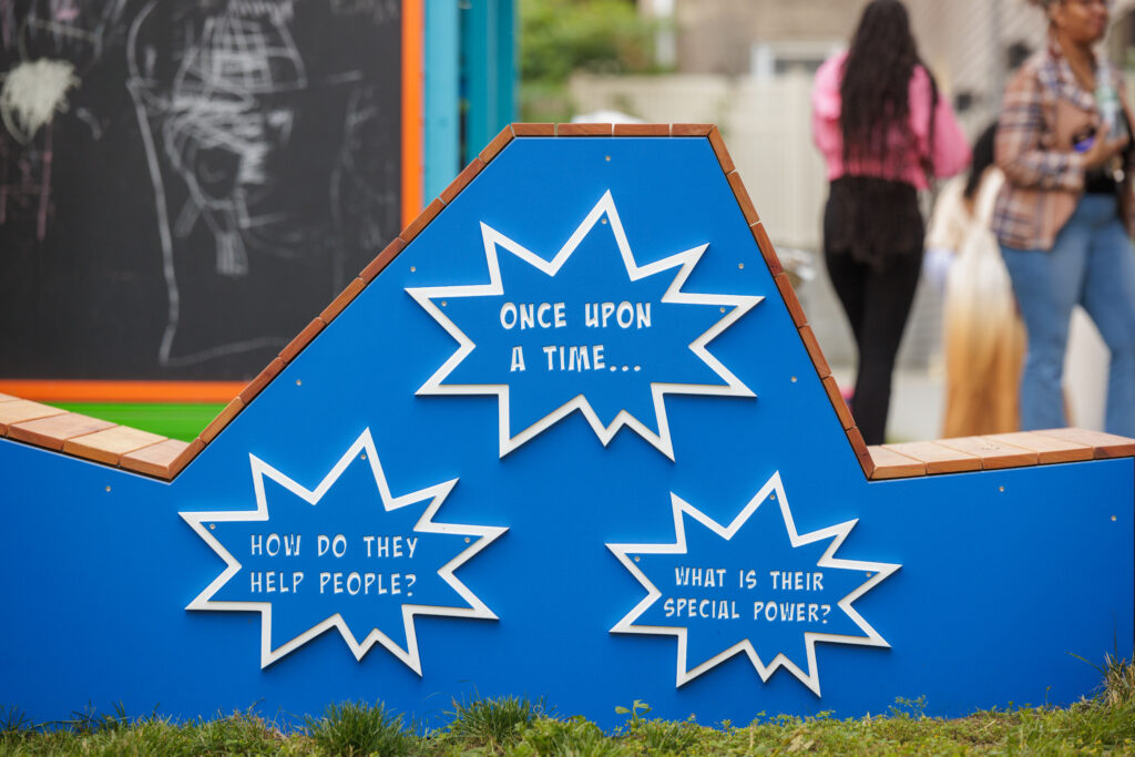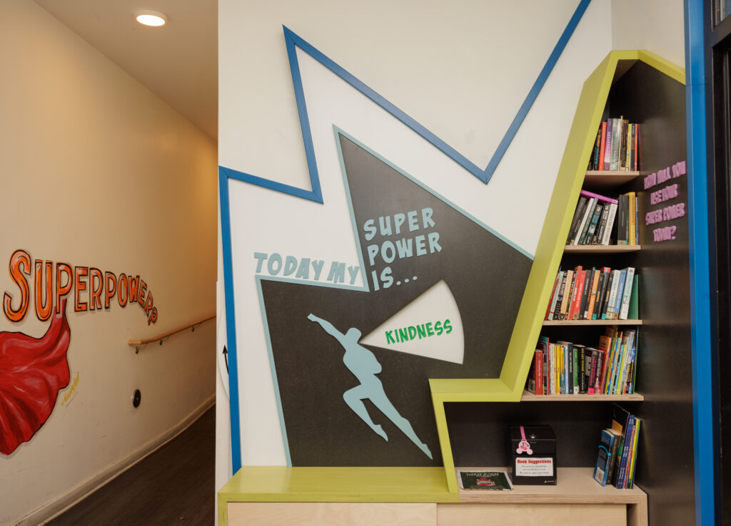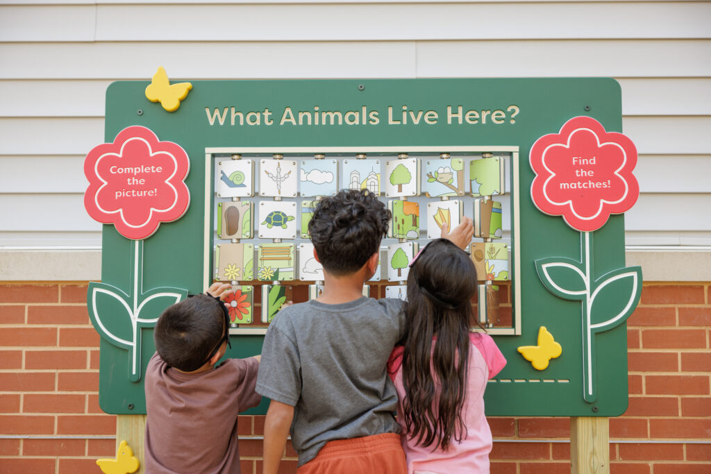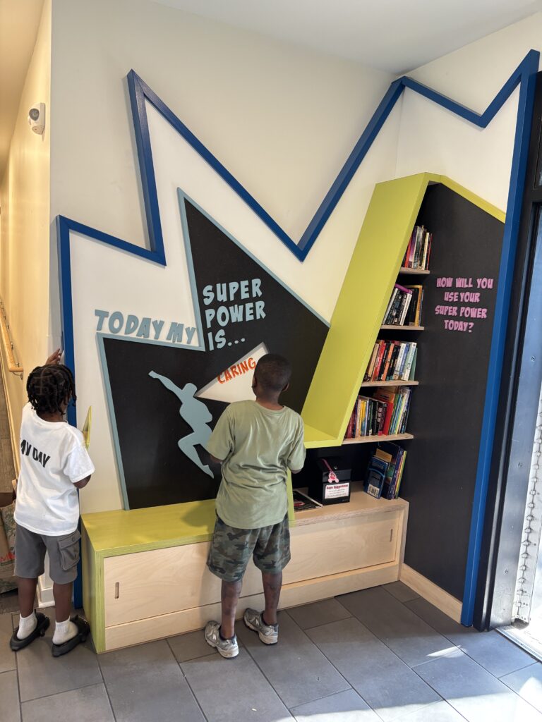 At Susquehanna Square, children practice early literacy skills through playful engagement with murals, panels, and word searches. They build creative expression and confidence by using the chalkboard wall and stage for storytelling and pretend play. Social and emotional learning is strengthened as children take on superhero roles that emphasize kindness, courage, and community. Shared reading and conversation are supported through the lending library, while interactive spinning wheels and panels encourage critical thinking and open-ended exploration.