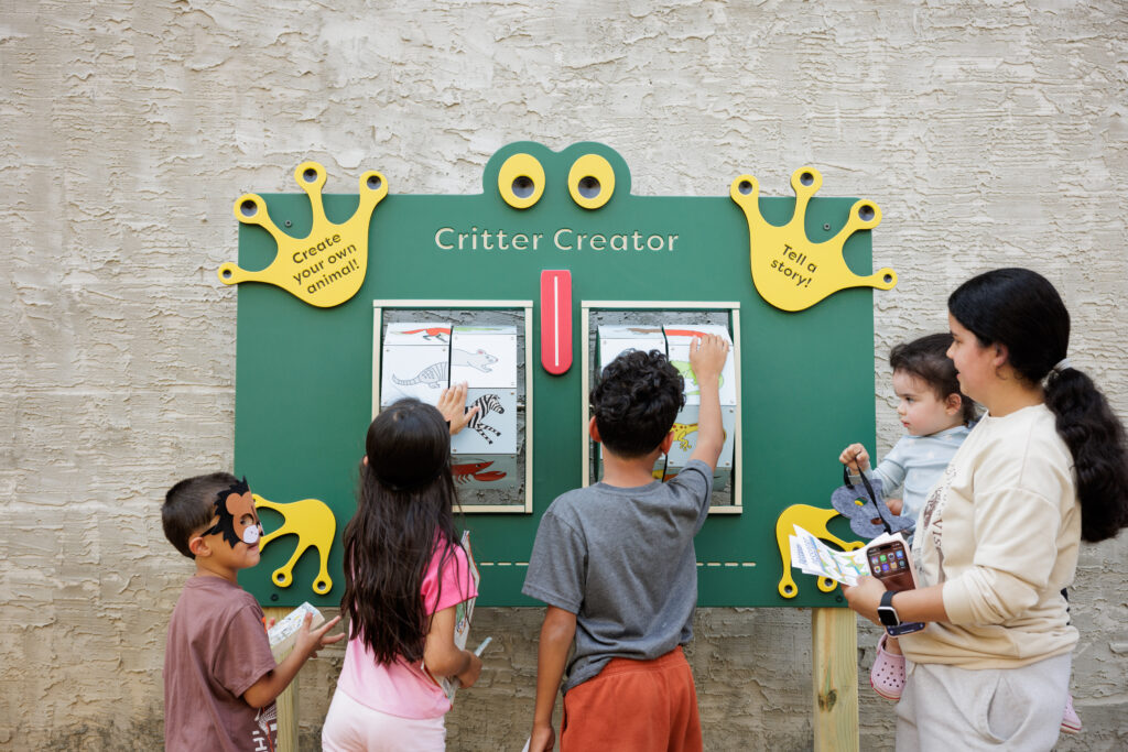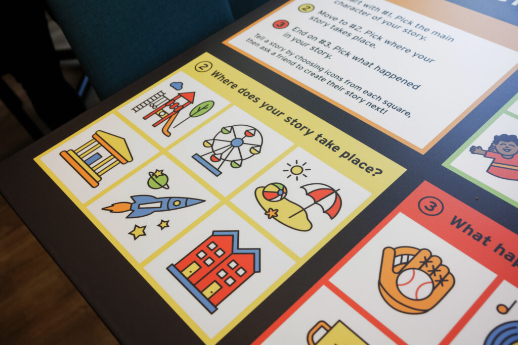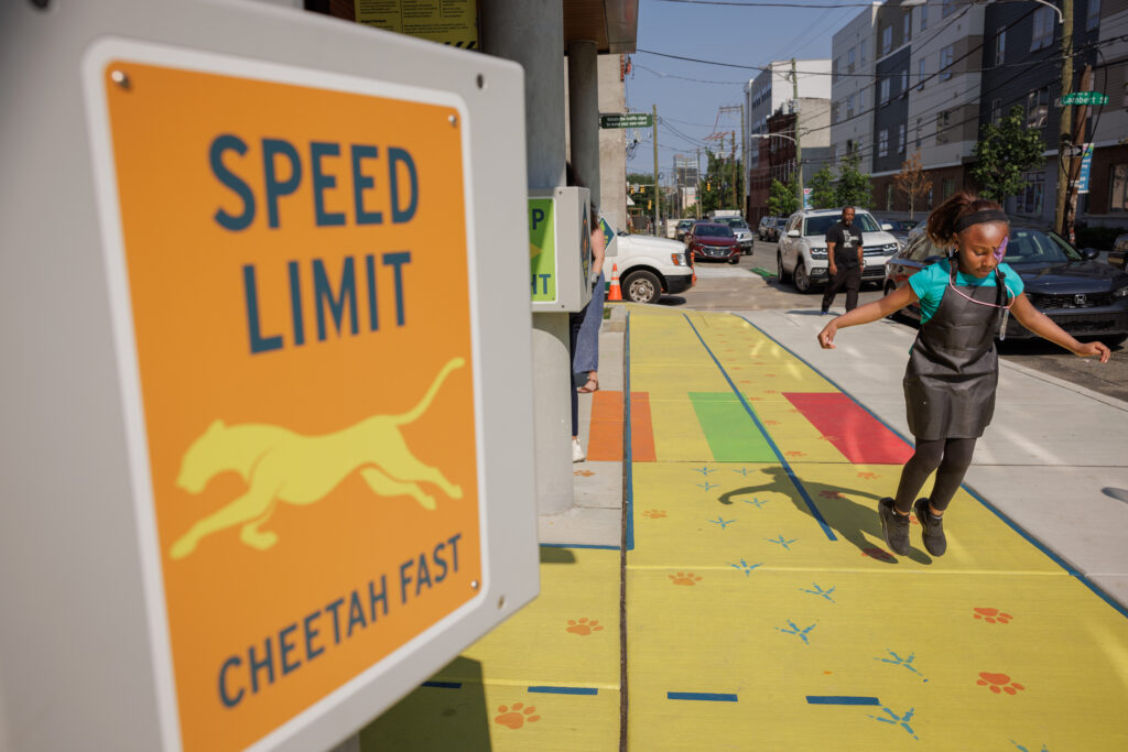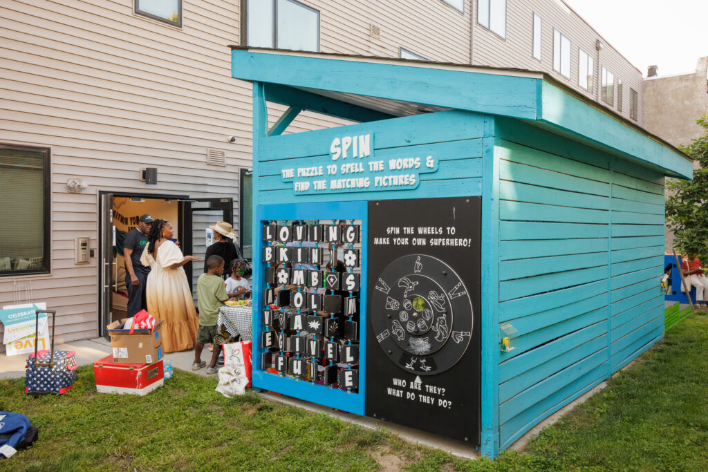 At Sharswood, children and caregivers engage in observation and conversation as they explore murals, tabletops, and puzzles. Children practice early math and spatial reasoning by navigating the customizable roadway, solving puzzles, and recognizing patterns. They also use imaginative play and movement with the roadway and animal spinning wheel to build storytelling and motor skills, while collaboration and problem-solving are fostered as families engage with the installations together.