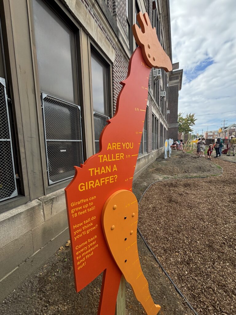 The Logan Nook of Discovery helps children build content knowledge through interactive prompts that connect play with math, measurement, language, and storytelling. Large animal and bird cutouts, an archaeological sandbox, and playful signage encourage students to explore academic concepts in ways that feel fun and natural. The space also fosters confidence, as students navigate challenges, share discoveries, and take ownership of a play area they helped create. This sense of pride strengthens both learning and community connection, showing children that their voices and efforts can shape the spaces around them.