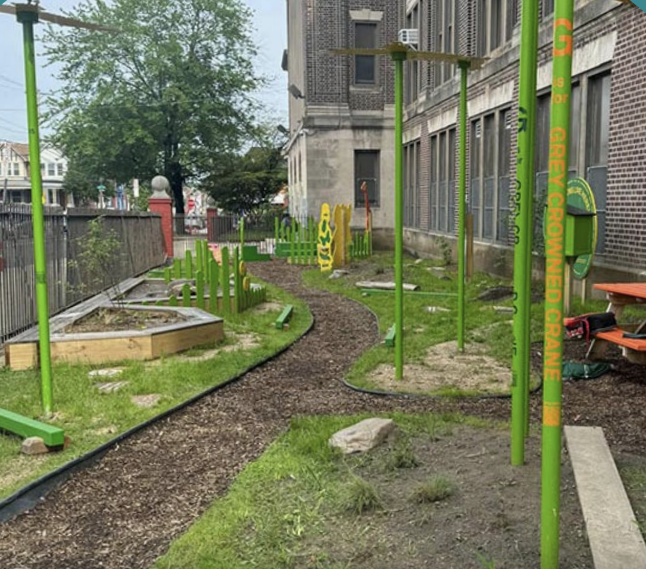 The Logan Nook of Discovery was created through a collaboration between the Indochinese American Council, Playful Learning Landscapes, Jay Cooke Elementary staff and students, the School District of Philadelphia, and TinyWPA.