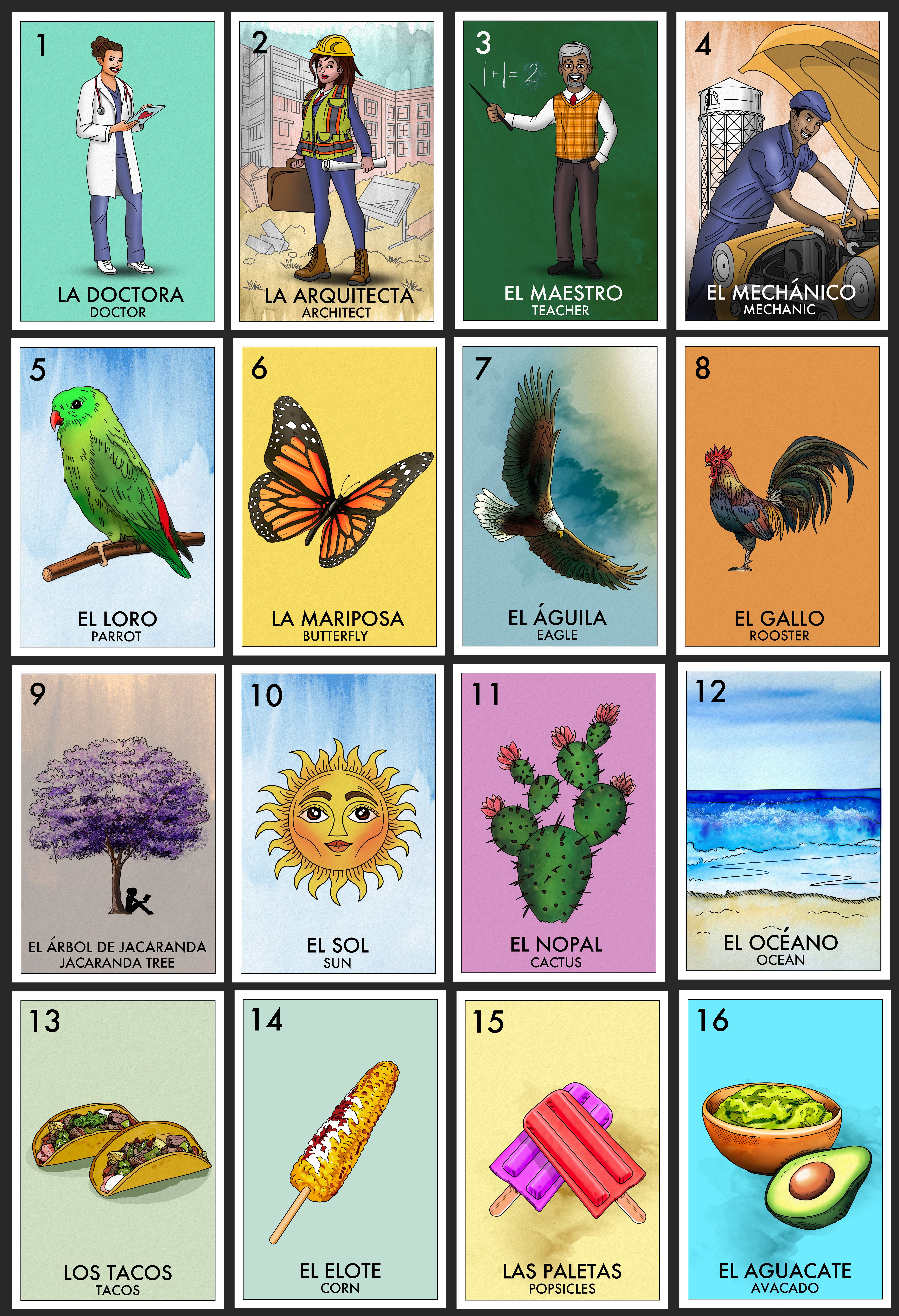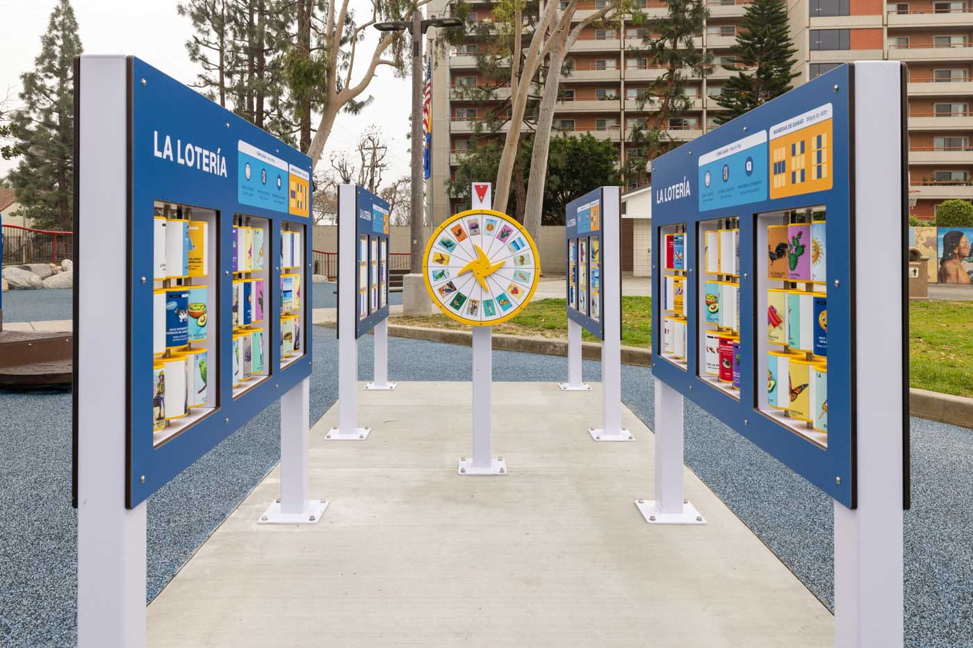 The Lotería installation was created through a collaboration between the City of Santa Ana, University of California, Irvine, Santa Ana Early Learning Initiative, and Playful Learning Landscapes.
