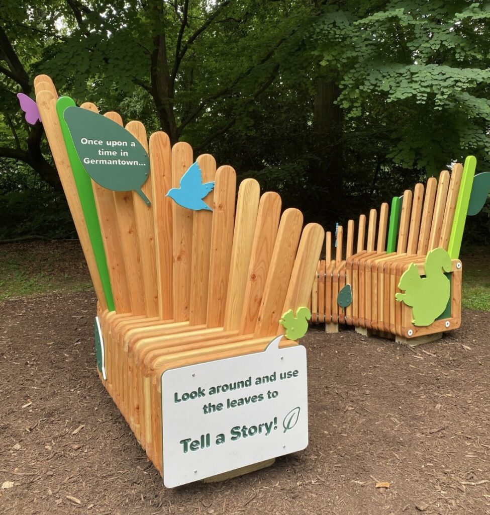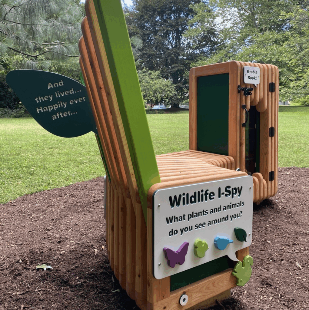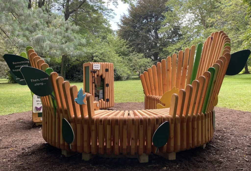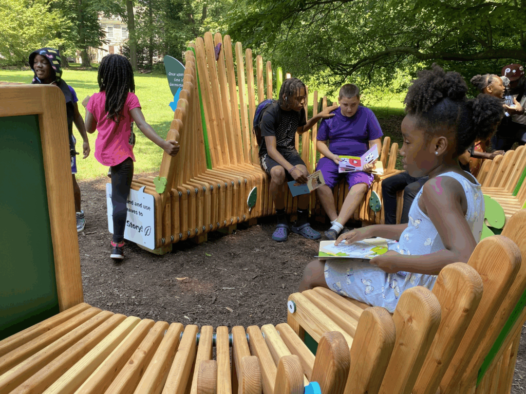 As part of the Literacy Rich Neighborhoods Initiative, The Nest is a welcoming outdoor installation designed to spark storytelling, reading, and imagination within a safe and nurturing space. Located on the historic grounds of Cliveden, it serves as a year-round destination for the community, supporting programs like the Community Summer Reading Camp at Holman Field and broader literacy activities. Shaped like a bird’s nest found in nature, the custom wooden structure includes a Little Free Library, multiple seating areas, colorful I-Spy wildlife elements, story starters, and an interactive audio story station. Surrounded by landscaped grounds, The Nest inspires creativity and connection while linking children to neighborhood stories that build vocabulary, foster empathy, and encourage curiosity, communication, and critical thinking.